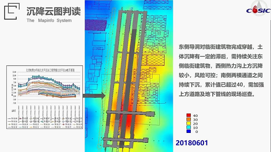 项目部在取得沉降监测数据后,除通过常规列表法绘制时间—沉降曲线外,还绘制了重要工点的沉降热图,更直观地了解判断沉降的区域变化情况。对持续沉降变形部位重点关注,加强监测和巡视。首次在地铁监测中使用的“沉降云图在变形监测中的应用”技术,申请了航天设计院科研课题。