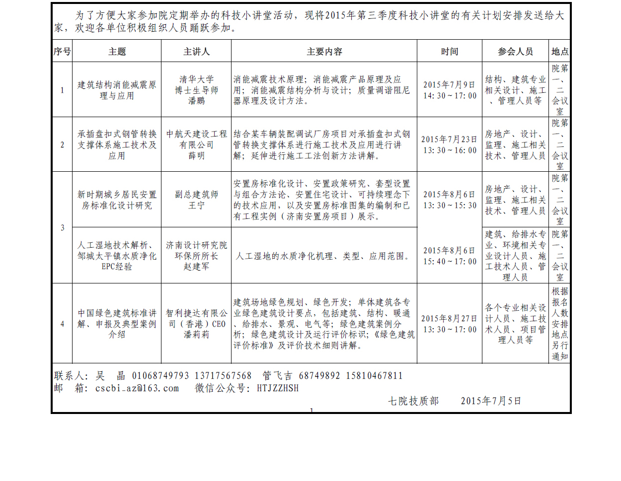 航天七院2015年第三季度【航天建筑 科技小讲堂】计划