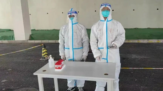 小组成员身穿防护服、医用鞋套,戴好防护口罩、乳胶手套、护目镜或隔离面,手拿小喇叭,引导现场人员有序排队检测,耐心提醒群众戴好口罩,保持2米安全距离,协助医护人员进行身份信息登记,确保核酸检测采样工作高效完成。