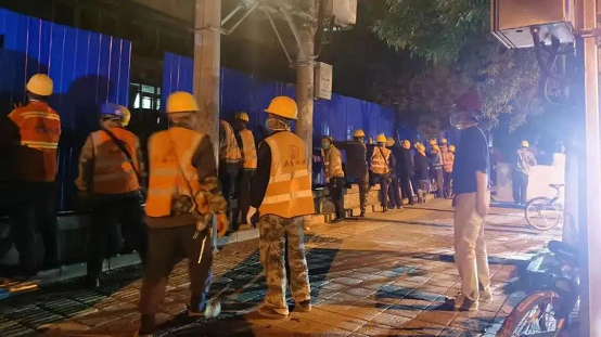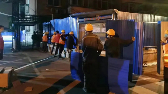 中航天公司党委高度重视,连夜从9号院职工住宅项目部抽调56名精干人员,组成应急施工小组,1小时内人员和设备抵达现场。公司党委现场召开紧急动员会,分几个小组平行作业,公司及分公司领导现场协调指挥。经过近4个小时的奋战,圆满完成近1000米围挡搭建。