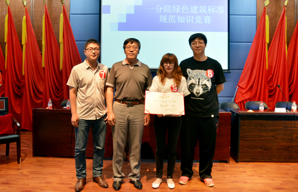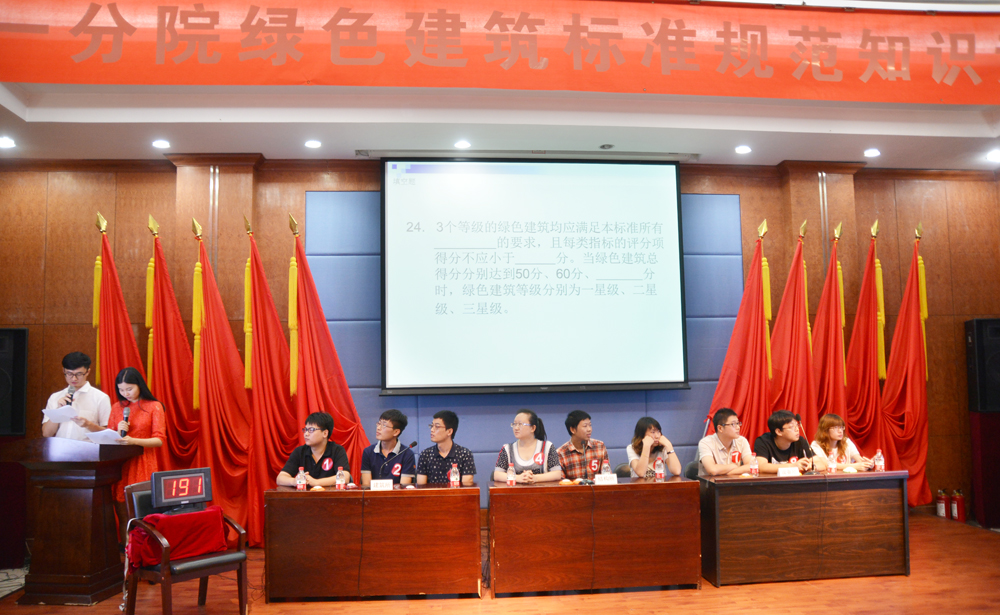 本次竞赛设建筑、结构、设备三只代表队,共9名队员参赛。竞赛共设三个环节,即必答题、抢答题及观众互动环节。试题内容紧扣绿色建筑,着重考察参赛人员对绿色建筑等专业性知识的掌握程度。现场各参赛队员踊跃答题,反应迅速,正确率高,难分伯仲。场下各所参赛口号此起彼伏,所有观众不分彼此,积极为参赛队员加油鼓气,竞赛气氛更加团结、紧张、热烈。最终设备代表队力挫群雄,勇夺分院最佳团体冠军,王栋获得“分院最佳赛手”的称号。通过本次竞赛,大家在轻松愉快的氛围下完成绿建知识学习的同时,也增强了分院的集体荣誉感和凝聚力。