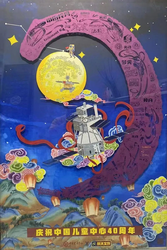 今年是中国儿童中心成立四十周年,“六一”前夕,航天建设实施特别行动策划,携手航天文创,联合北京工美集团,特邀国家非物质文化遗产——蔚县剪纸传承人周利伟,共同创作以《嫦娥奔月》为主题的“庆祝中国儿童中心成立四十周年”航天主题原创剪纸作品,在“六一”当天赠予中国儿童中心,第一时间为祖国花朵送上祝福。作品以“儿童+航天+科普教育”为主线,是中国航天文化与中华传统文化艺术跨界碰撞的有益尝试和创新,以此传递并激发青少年儿童的强国情怀,点燃孩子们的航天梦,该作品现已被中国儿童中心收藏。