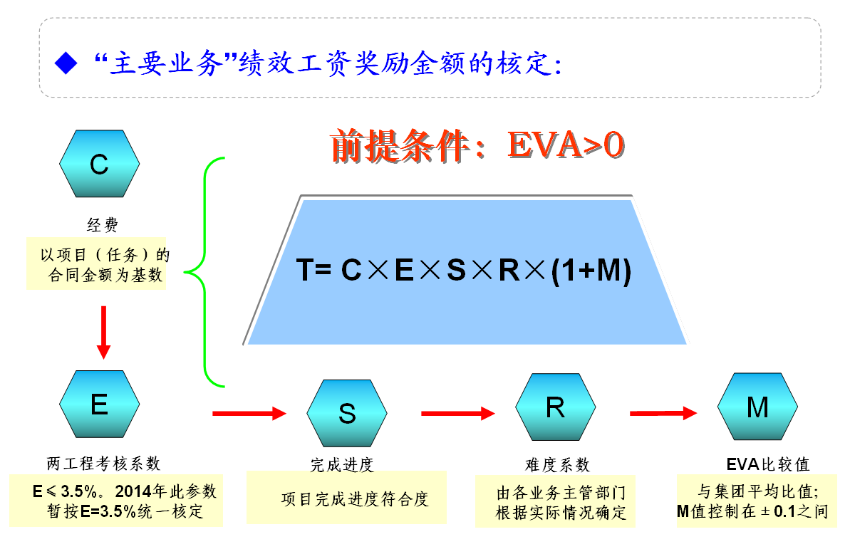 指标解读:E、R指标为年度固定值,S为项目进度完成度,C值为申请“主要业务”工资最重要的指标,从2014年度“主要业务”工资申报中,结合进度完成度提取的C值为项目的年度内到款总额。因此,项目的回款进度将对绩效工资总额起到重要影响。除此之外,项目的EVA和EVA率的改善与提高也可以在一定程度上增加“主要业务”绩效工资核定额。