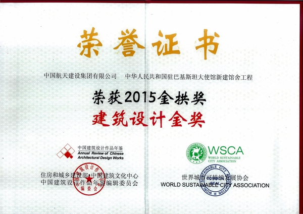 近日,中国航天科工七院报送的“中华人民共和国驻巴基斯坦大使馆新建馆舍工程”和“酒泉体育馆(方案)”两项目喜获“2015金拱奖—建筑设计金奖”。