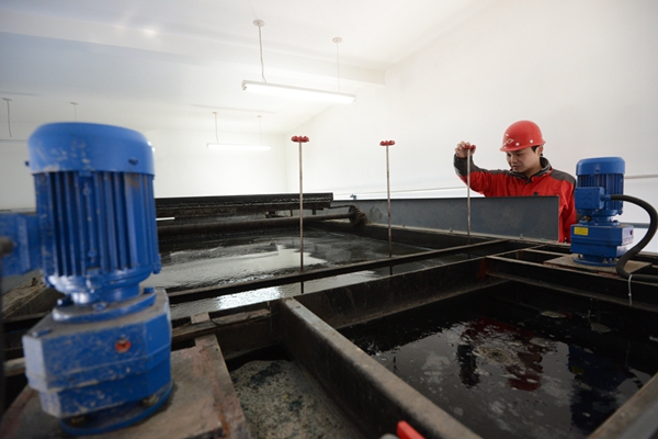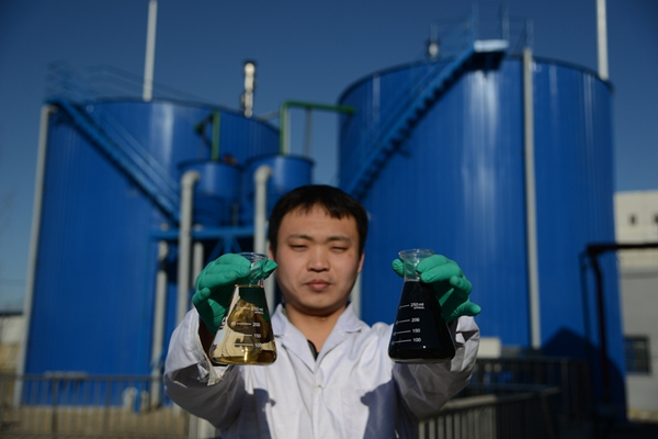 上图为工作人员在污水处理设备前展示污水处理前后水质对比,原中药废水气味难闻,处理后可直接浇灌或排入河流。(宿东 王益青 摄文)