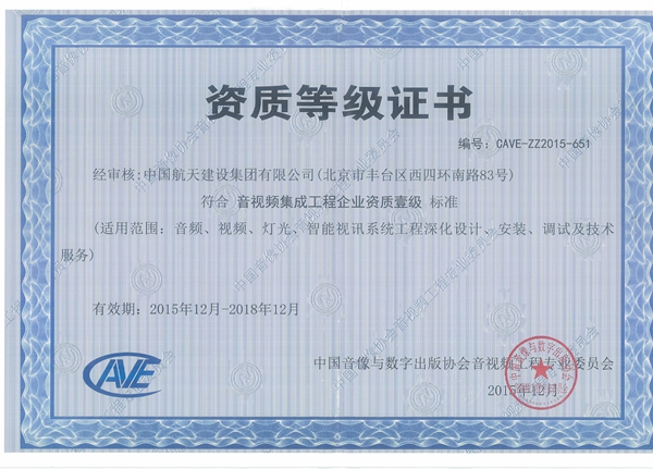 近日,中国航天科工七院成功通过《音视频集成工程企业资质》审核,获得《音视频集成工程企业壹级资质》,适用范围:音频、视频、灯光、智能视讯系统工程设计、安装、调试及技术服务。此证书的获得肯定了七院在音频、视频、灯光、智能视讯系统集成的综合能力。同时,扩大了在智能化建设工程领域的承接范围。 音频、视频、灯光、智能视讯系统集成工程企业资质等级评定规则由中国音像协会制定和发布,中国音像协会音视频工程专业委员会负责实施和管理。(文/市场部)