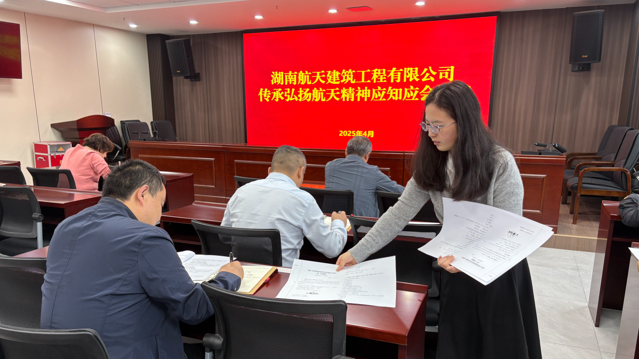 湖南航建发布年度传承弘扬航天精神工作计划和应知应会手册,以党委理论学习中心组、基层党支部为单位,组织全体党员开展航天精神应知应会测试,通过“以考代练”的方式夯实航天人的身份意识。组织项目部举行升旗仪式,为高质量完成年度任务积蓄动力。