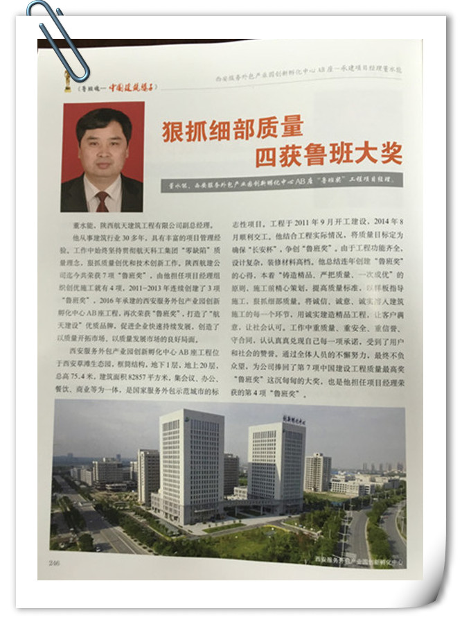 近日,全国建筑业企业创建“鲁班奖”工程项目经理高级研修班在长沙举办。研修班上,举行了2016~2017年度第一批鲁班奖工程经验交流专辑即《鲁班魂——鲁班传人经验及案例选编》首发式,并对荣获2016~2017年度第一批“鲁班奖”工程的项目经理进行了表彰,颁发了荣誉证书。由航天科工七院所属陕西航天建筑工程有限公司承建的西安服务外包产业园创新孵化中心AB座工程从全国众多精品工程中脱颖而出,被列入交流专辑之中。该公司副总经理、第五公司经理董水能被评为2016~2017年度第一批“鲁班奖”工程项目经理。