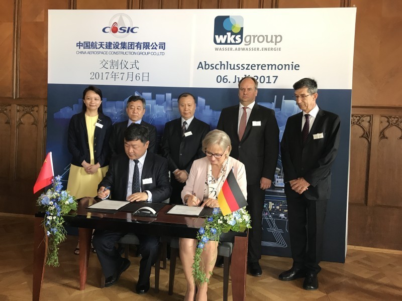 在中国国家主席习近平对德国进行国事访问并出席G20汉堡峰会期间,德国时间7月6日上午,中国航天建设集团有限公司(中国航天科工七院)并购德国WKS公司交割签约仪式在德累斯顿举行。这标志着航天建设集团第一宗海外并购案顺利完成,WKS公司正式进入航天建设集团麾下。中国航天科工集团公司董事长高红卫,德国德累斯顿市市长迪克. 赫伯特、萨克森州环境保护部副部长施瓦策博士,中国工商银行法兰克福分行总经理郑东林,科工集团公司国际部部长曹伟、副部长韩广荣,航天建设集团董事长高峰、副董事长窦晓玉,WKS公司总经理Peter R?uber女士等相关人士共同出席交割仪式。