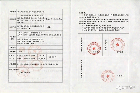 紧接着19日,陕西韩城传来捷报,湖南航建喜中韩城市黄河新区金岸大道道路建设工程项目,中标金额2.6亿元。该项目位于陕西省韩城市黄河新区,路幅宽度40m,主要包括:道路、交通、雨水、污水、电力电信、照明等工程。项目建成后将成为韩城市黄河新区瑶主干道之一,为公司拓展市政公用工程业务并创建业绩标杆项目提供宝贵积累。