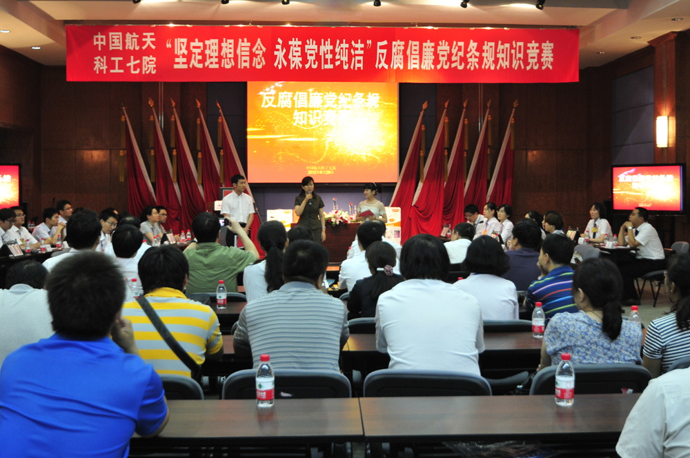 七院党委副书记、纪委书记李秀芬代表院党委为本次活动致辞,她指出:近年来,在院党委的正确领导下,院纪委坚持 “标本兼治、综合治理、惩防并举、注重预防”的方针,把反腐倡廉教育作为常态化的基础性工作来抓,不断创新形式和内容,通过教育倡廉、典型导廉、警示促廉、活动兴廉、媒体传廉,多措并举筑牢各级领导干部的思想道德防线。今年五月份,院纪委在全院范围内开展了“坚定理想信念,永葆党性纯洁”为主题的教育宣传月活动,活动期间,院纪委为各级领导干部精心选购并配发了《官德的力量》等廉政书籍;在内网上进行“廉政模范事迹与警示案例”连载;组织参观教育基地等一系列活动,所属单位也积极组织开展了各具特色的廉洁教育活动,活动开展地有声有色,取得了较好效果。按照年初制定下发的《院纪检监察工作要点》要求,围绕社会主义核心价值体系这一主题,结合理想信念教育、党性党风党纪教育和廉洁从业教育,院纪委组织了此次反腐倡廉党纪条规知识竞赛活动,同时也是为参加科工集团公司近期将要组织的反腐倡廉知识竞赛做选拔,希望通过这样的活动,进一步提高各级领导干部对党纪条规、政策法规的理解和掌握,促进我院各级领导干部知法、懂法、守法,忠实履行职责。 在经营生产工作中,自觉做到廉洁自律、遵纪守法,以实际行动为我院健康发展、安全发展,营造廉洁和谐氛围。