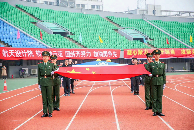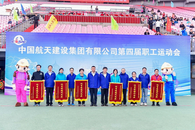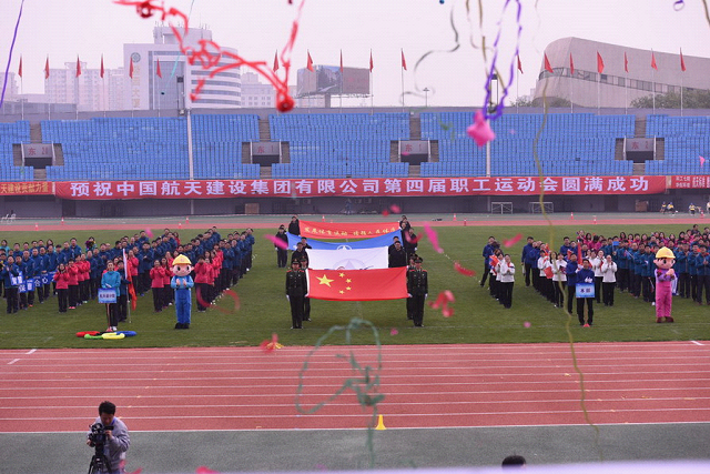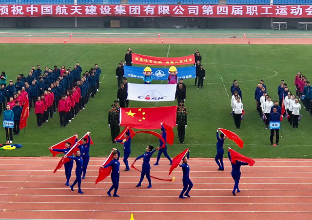 开幕式上,雄壮庄严的国歌和激昂奋进的航天科工之歌先后奏响,鲜艳的五星红旗和航天科工司旗冉冉升起。七院党委书记、董事长高峰宣布:中国航天建设集团有限公司第四届职工运动会开幕!绚丽的彩带从礼炮中绽放,航天建设卡通形象“航小柒”等人偶热情起舞,观众们热烈欢呼,将开幕式推向了高潮。