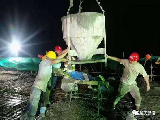 就在项目主体封顶的那一天晚上,突击队还差最后一斗料没有浇筑,这时“雨神”光临,下起了小雨,当最后一斗料浇筑完成,开始收面的时候,雨顿时大了起来。项目部所有的人员齐上阵,撑起覆盖膜,如同一个帐篷把收面的工人师傅罩在里面,让他们安心完成最后的工作。虽然倾盆大雨打湿了每个人的衣服,冰冷了每个人的身体,但此刻他们的心是火热的,他们用行动诠释了什么是“自力更生、艰苦奋斗、大力协同、无私奉献、严谨务实、勇于攀登”的航天传承,他们用行动展示了什么是“特别能吃苦,特别能战斗,特别能攻关,特别能奉献”的载人航天精神。不忘初心,牢记使命,万山项目终于在8月31日凌晨3点钟完成结构封顶。施工质量得到建设方、监理方和公司领导的一致认可。