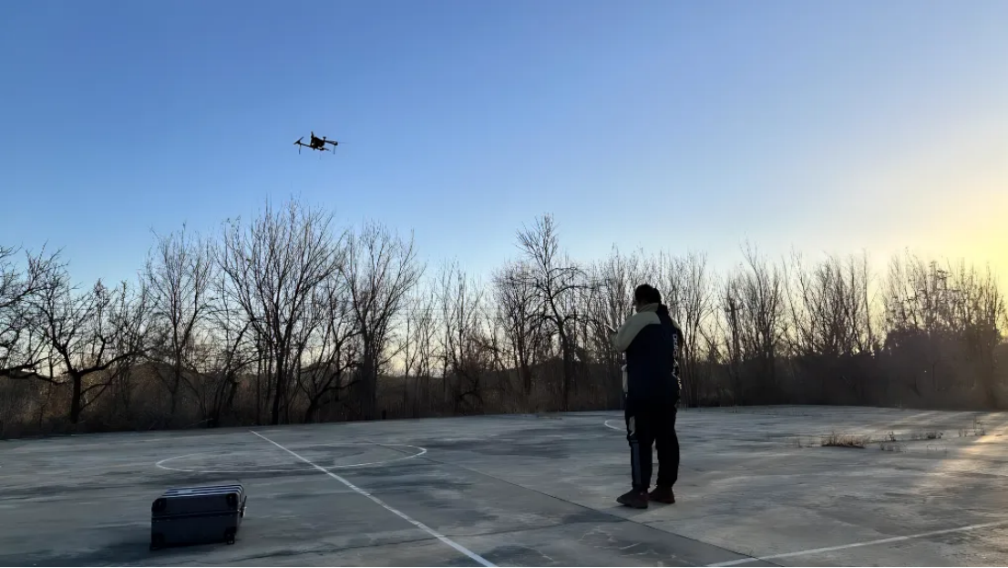 “注意路面结冰和冻土,湿滑路面会影响仪器的稳定。”张新的喊声被寒风和无人机螺旋桨轰鸣扯得断断续续,他扛在肩上的测量仪在颈窝处压出深深的红印。