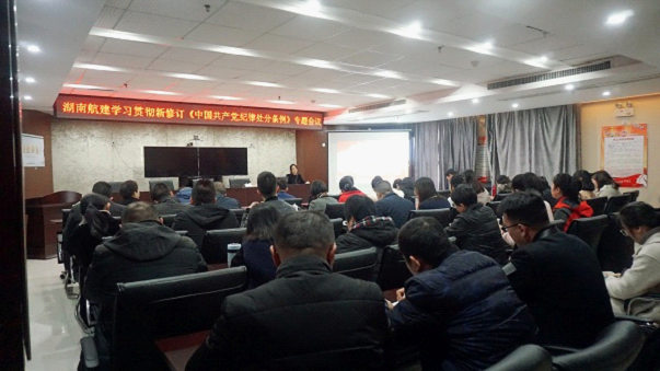 2018年12月6日下午,中国航天科工七院所属湖南航天建筑工程有限公司党总支在公司会议室,组织全体党员学习宣传贯彻新《中国共产党纪律处分条例》,以公司党总支纪检委员、副总经理李大鹏同志主讲党课的形式开展专题学习,公司党政领导班子、党员干部共50余人参加。活动由公司纪检监察部副部长唐倩主持。