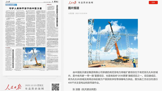 12月23日,《人民日报》以新闻方式刊发了航天建设肯尼亚电力传输扩建项目工程进展。该项目位于肯尼亚孔扎科技城内,占地面积超28英亩,是肯尼亚目前最高电压等级的交流主干网节点变电站,是共建“一带一路”倡议在肯尼亚的重要项目,也是肯尼亚政府“2030愿景”旗舰项目之一。项目建成将满足肯尼亚中央裂谷区域及北部区域电力外送需求,增强肯尼亚电网的安全性和稳定性,为孔扎科技城提供重要电力保障,解决周边数万户居民和学校用电难问题,提高人民生活水平,满足国家经济发展需要。项目的实施已为当地居民提供数百个就业岗位,培养电力专业技术人员超百人,促进了中非友谊和经贸往来。2022年该项目被驻肯尼亚使馆授予“一带一路”创新实践项目。