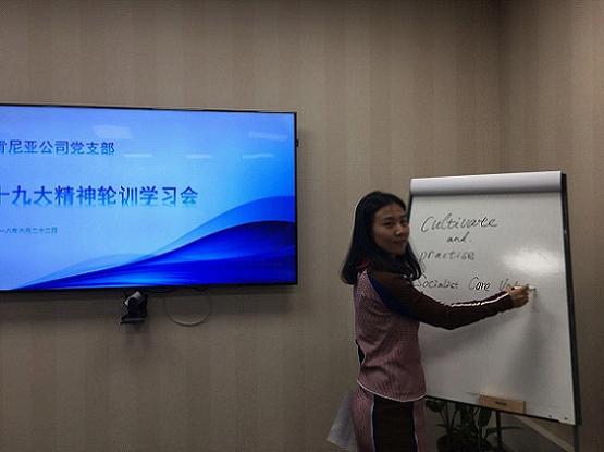 白天的肯尼亚公司办公室仍旧可以看到每个人忙碌的身影,晚上7点开始,跨越支部(来自不同支部的党员)、跨越身份(不分领导与职工,均以普通党员身份参与)、跨越地区(工地现场党员以语音连线方式参与),9名党员同志用自己业余时间精心准备的演讲稿,以精神饱满的态度结合自己的学习和认识、结合自己的工作和对公司发展的建议,分别带领大家围绕十九大报告“不忘初心,砥砺奋进”、“一带一路”、“新时代特色社会主义思想”、“开放新格局”、“新时代国际业务开展”等方面进行了深刻的学习。员工陈方琳更是用全英文为大家上了一堂生动的“贯彻十九大精神:培育和践行社会主义核心价值观的畅谈体会”。活动最后,党员同志逐名分享了自己的感想,会上气氛热烈,全体党员受益匪浅。