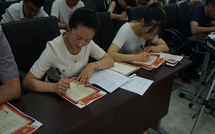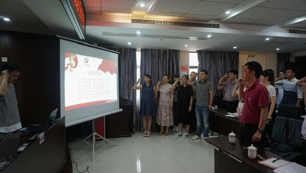 上午的分享会还穿插了发展新党员、预备党员转正仪式,全体党员重温誓词等环节,下午党员干部继续在21楼会议室共同观赏了爱国主义教育影片《红海行动》,感受着中国海军“蛟龙突击队”8人小组的国家精神,大家纷纷在特制的党徽卡片上写下观影感言自勉。