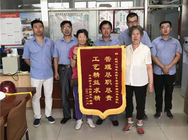 业主的评价都来自于点滴细节。有一次,技术员何晓卿在现场崴了脚,一位老奶奶连忙送来了药和水果表示关心;平日里,项目部人员若在楼道里碰见住户,帮忙搬下东西、上门和孤寡老人谈谈心,这些都是再寻常不过的事。正是这样的点滴积累,项目部成员与邻里居民建立了真挚的情谊。为了表达对项目部成员的感谢,居民们还委派代表亲自把锦旗送进了项目部办公室。