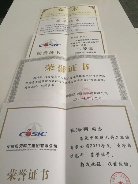 崔海明于2007年入职航天建设工作,现任航天建设航天设计院一综院电气所二室主任,高级工程师。从“战斗力只有五的渣”的设计员做起,稳扎稳打,层层突破,逐步成长到不拖后腿,到业务骨干,到获奖颇多的设计师,再到如今的获得“科工集团青年岗位能手”称号。若问起有何经历收获,且听道来: