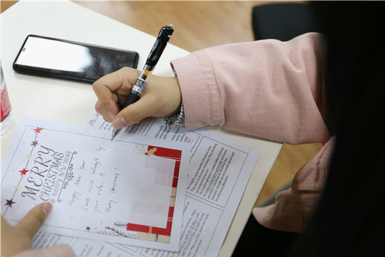 活动很快来到高潮,Andy老师让各位小伙伴在愿望卡片中分享了自己的圣诞愿望,就这样,各式千奇百怪的愿望纷纷被收集在了Andy老师的手中。“I want a boyfriend”、“I want a girlfriend”、“more and more money”、“travel round the world”、“love and peace”……