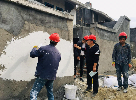 张剑锋在报戈村4组进行技术交底,向劳务人员明确抹灰、腻子、涂料等装饰装修作业的施工标准。