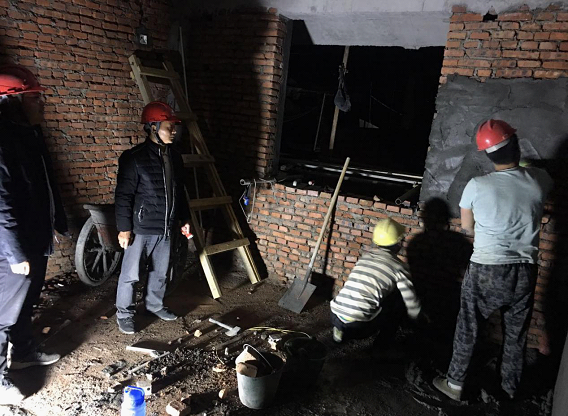 临近深夜,现场还在紧张的施工中,能抢一点是一点,能快一天是一天,灯光下王晨和罗建在旁监督。