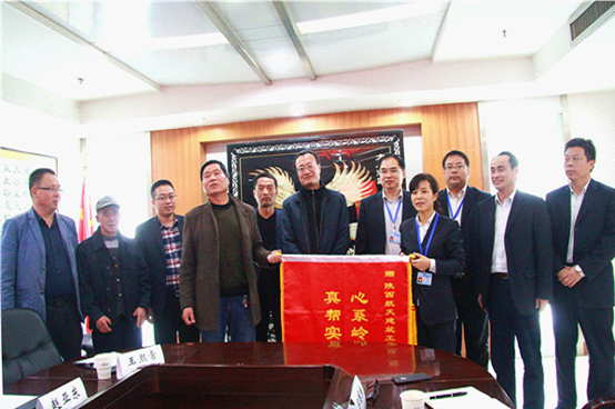 10月24日,西安经开区管委会扶贫领导小组组长曹益、第一书记苟拓、联络员赵亚东及西安市蓝田县三观庙镇金山村支部书记王旭华、村主任刘建峰等一行7人赴陕西航天建筑工程有限公司进行扶贫座谈,同时送来一面锦旗,感谢公司在扶贫工作中对金山村的帮扶与资助。公司董事长、总经理、党委副书记翟再文,党委书记、副总经理、工会主席谢明娟,副总经理董水能等领导参加座谈会议。